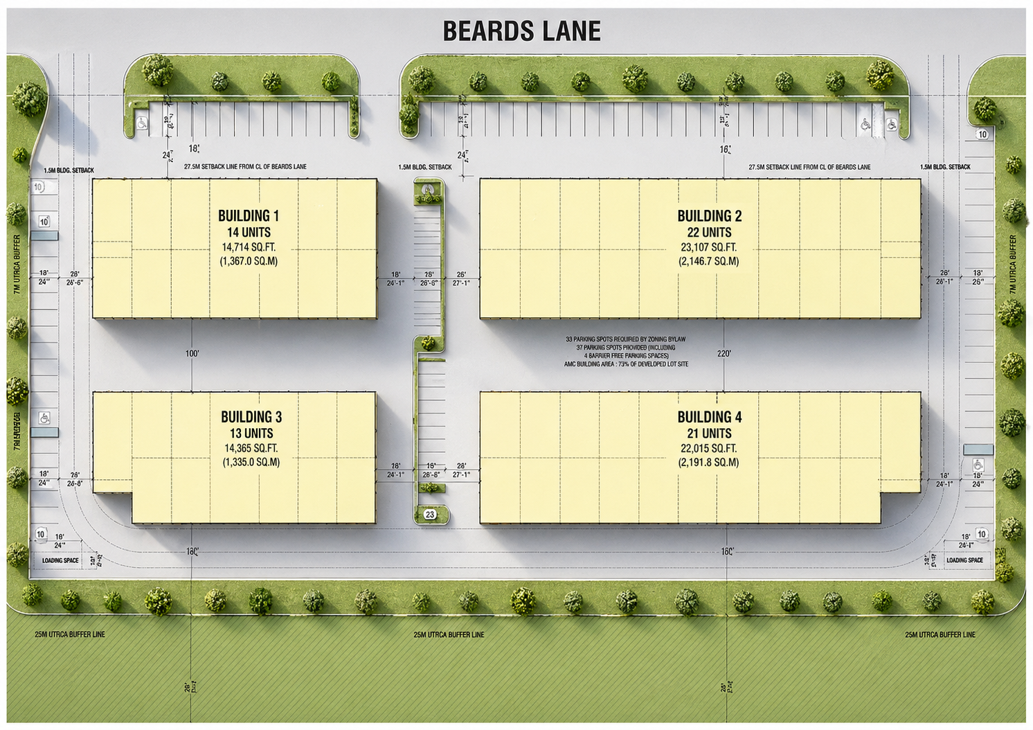 The site is laid out around a generous central drive aisle with transport-truck circulation, dedicated loading at every bay, asphalt parking, and a landscaped UTRCA buffer zone along the rear property line.